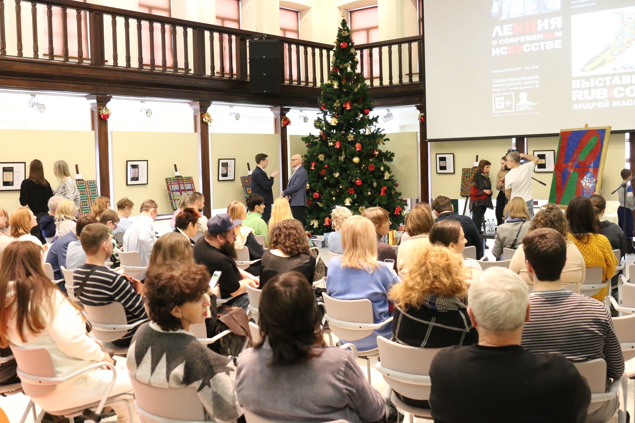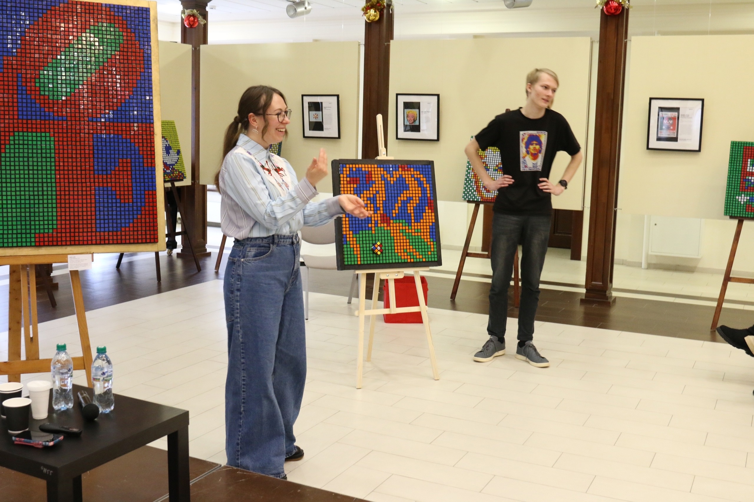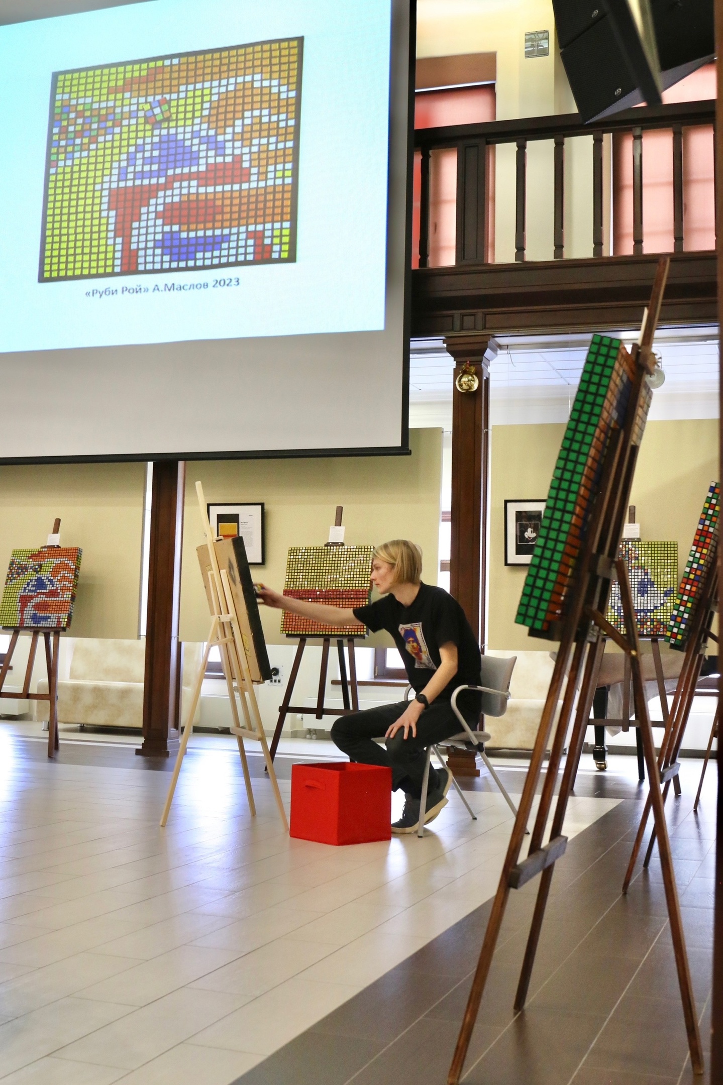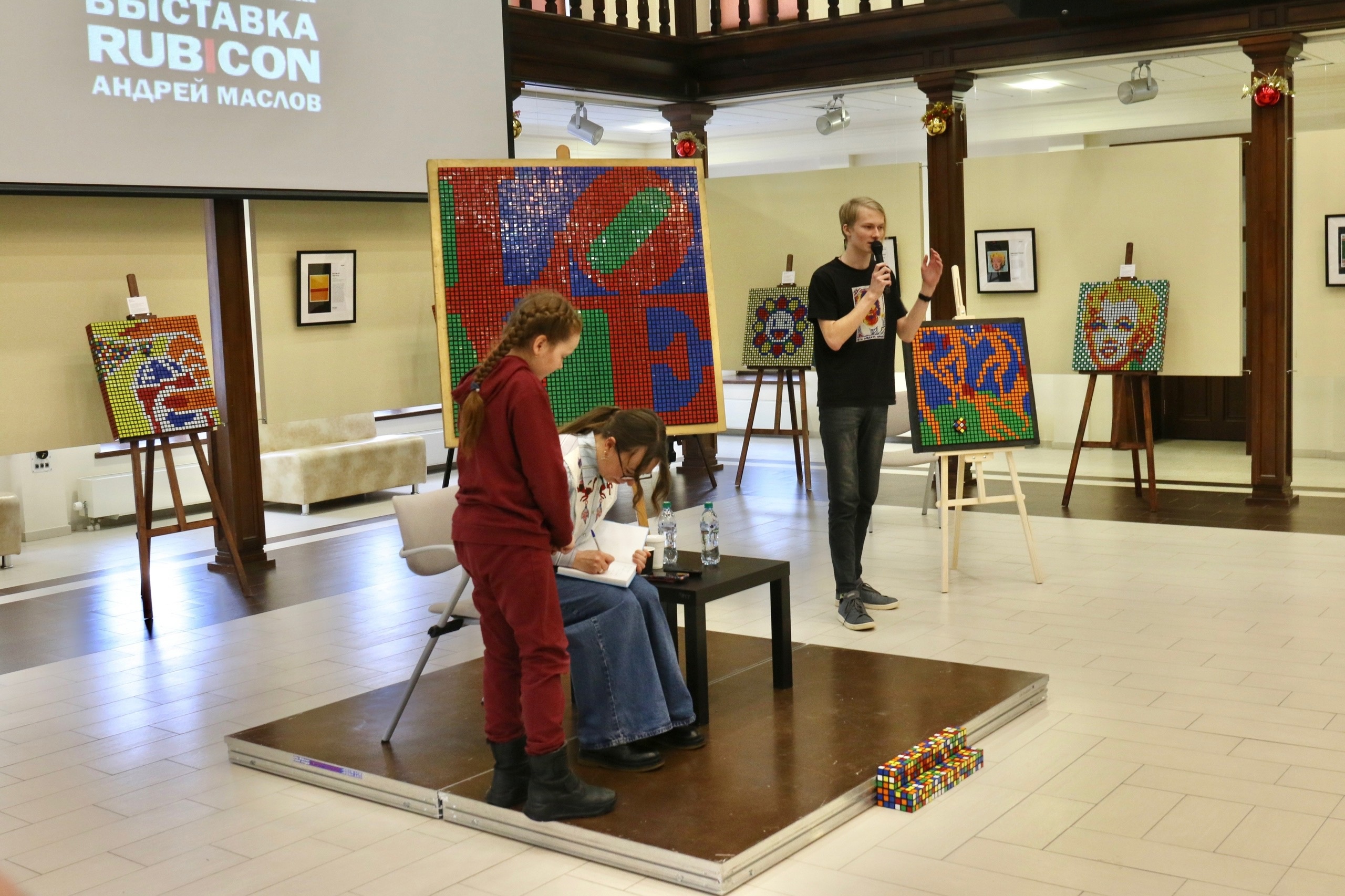Место и время проведения выбраны не случайно. С 16 декабря в Левитановском культурном центре работает выставка концептуальных мозаик из кубиков Рубика «RUBICON» дизайнера головоломок, спидкубера и рубиккубиста Андрея Маслова. Проект погружает посетителей в художественный мир авангарда, поп-арта и современного искусства. Работая с известными изображениями Уорхола, Малевича, Кандинского, Лихтенштейна и Мураками, Андрей наделяет их новыми свойствами, превращая круги в квадраты, точки – в пиксели, монохром – в цветовой хаос. Автор иронизирует над мировыми шедеврами, вращая грани кубика Рубика, и открывает для зрителя новые грани культовых образов.