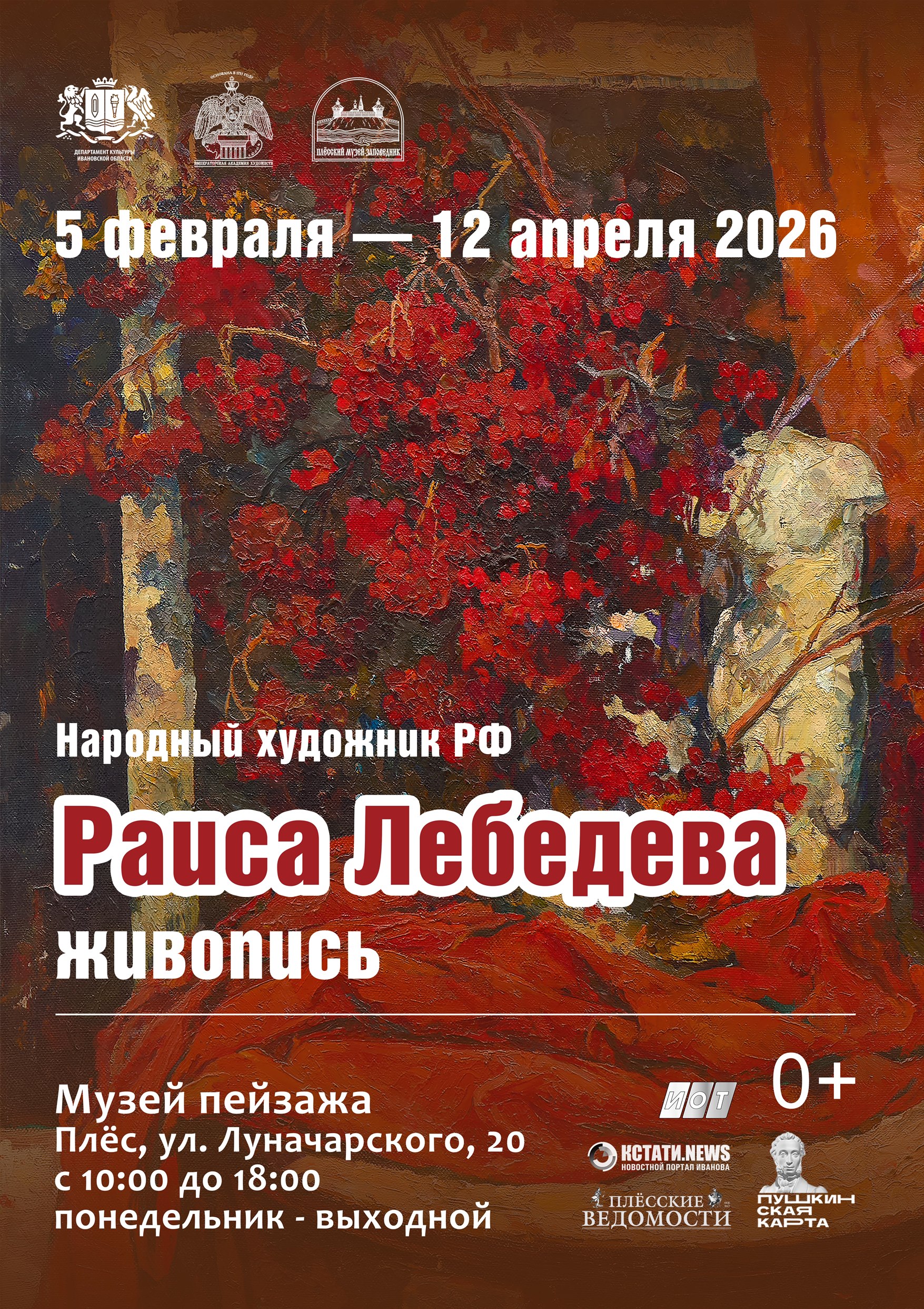 5 февраля 2026 г. в Музее пейзажа Плёсского музея-заповедника начнёт работу выставка живописных произведений народного художника РФ, члена-корреспондента РАХ Раисы Ивановны Лебедевой (1940-2025), посвящённая памяти автора. Большинство картин, представленных в экспозиции, созданы художником за последние 20 лет.
