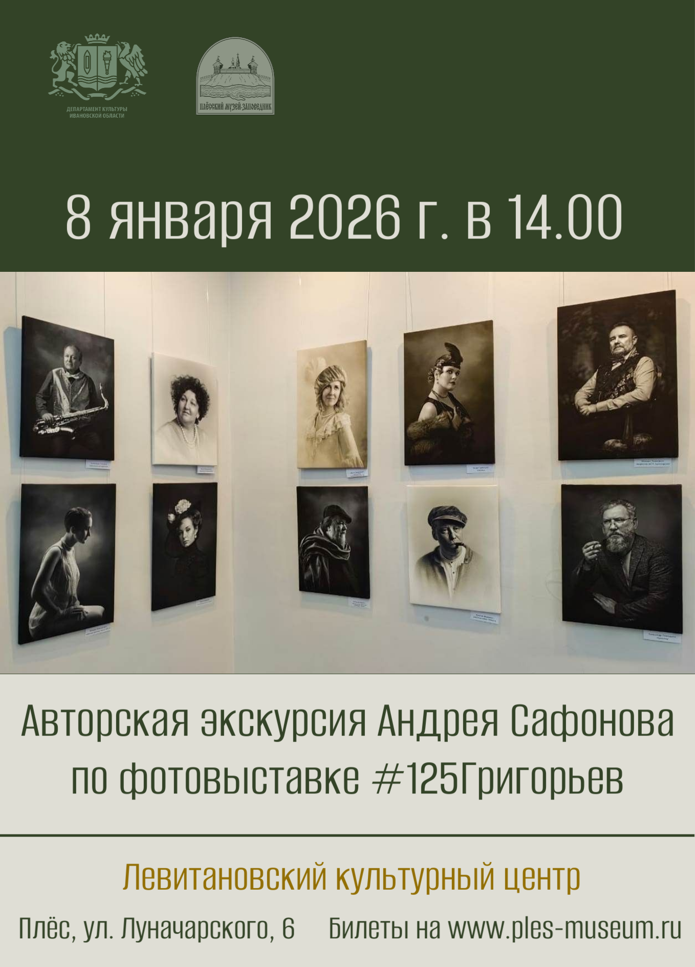 На авторской экскурсии один из создателей проекта ивановский фотограф Андрей Сафонов расскажет о жизни Павла Григорьева и о людях, позировавших для проекта «#125Григорьев». Более года он и Нина Семёнова создавали портреты современных жителей Иванова и Шуи в стилистике второй половины XIX – начала XX вв. Перед их объективами предстали артисты и музыканты, журналисты и блогеры, писатели и поэты, дизайнеры и музейные работники, дети и педагоги. Снимки публиковались в социальной сети ВКонтакте и сопровождались рассказами из жизни Павла Алексеевича и его коллег. Посты помечались хештегом #125Григорьев, который и дал название выставке.