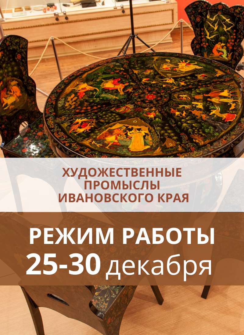 Уважаемые жители и гости Плёса, 25-30 декабря 2023 г. экспозиция «Художественные промыслы Ивановского края»будет закрыта для посещения.