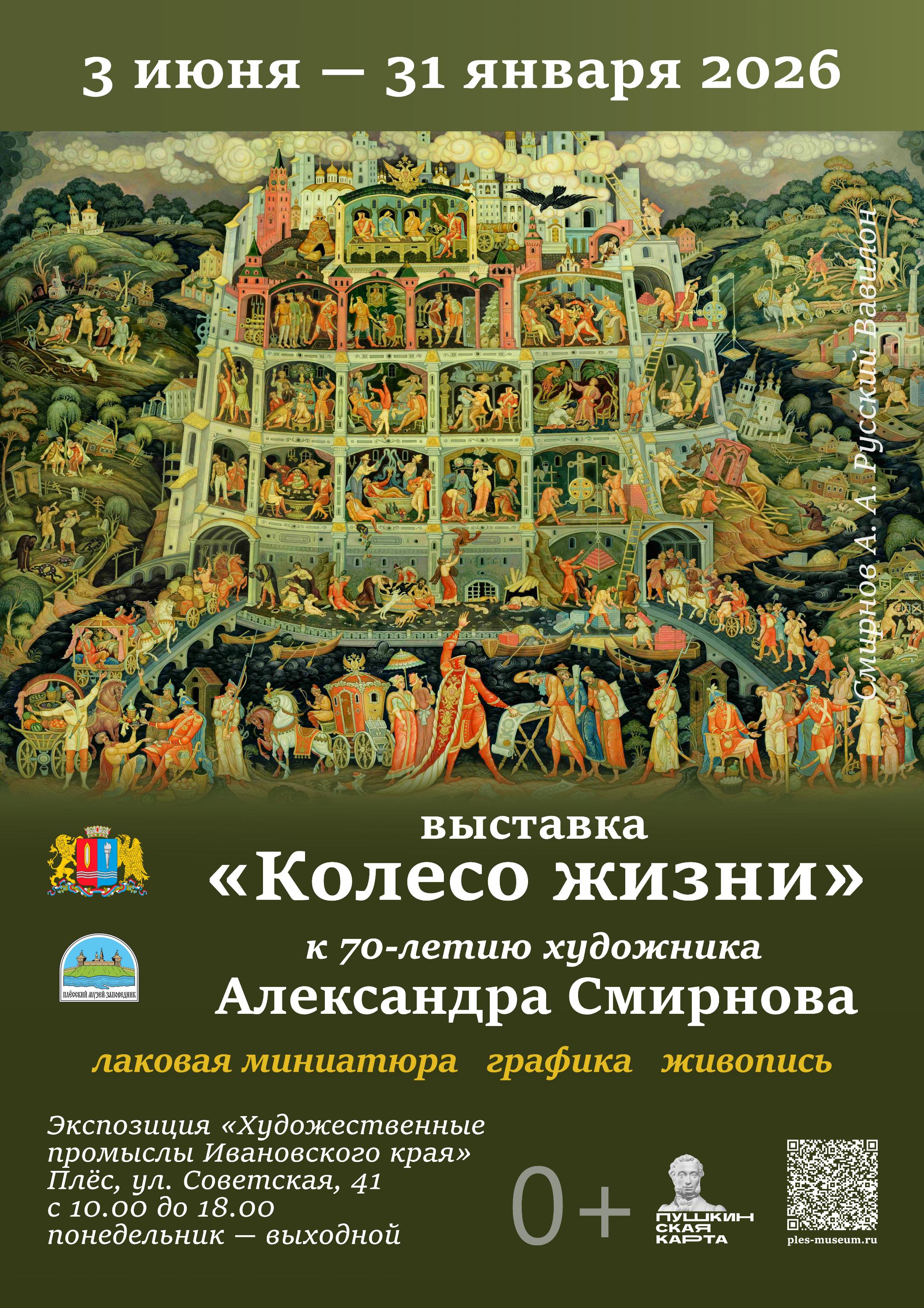 3 июня 2025 г. в экспозиции «Художественные промыслы Ивановского края» Плёсского музея-заповедника откроется выставка «Колесо жизни» почётного работника культуры Ивановской области, члена Холуйского отделения Союза художников России Александра Смирнова, посвящённая 70-летию мастера. Около 100 произведений лаковой миниатюры, графики и живописи подарят зрителям уникальную возможность оценить не только богатое художественное наследие А. А. Смирнова, но и продолжение семейных творческих традиций в работах его талантливых сыновей - Дмитрия и Алексея.