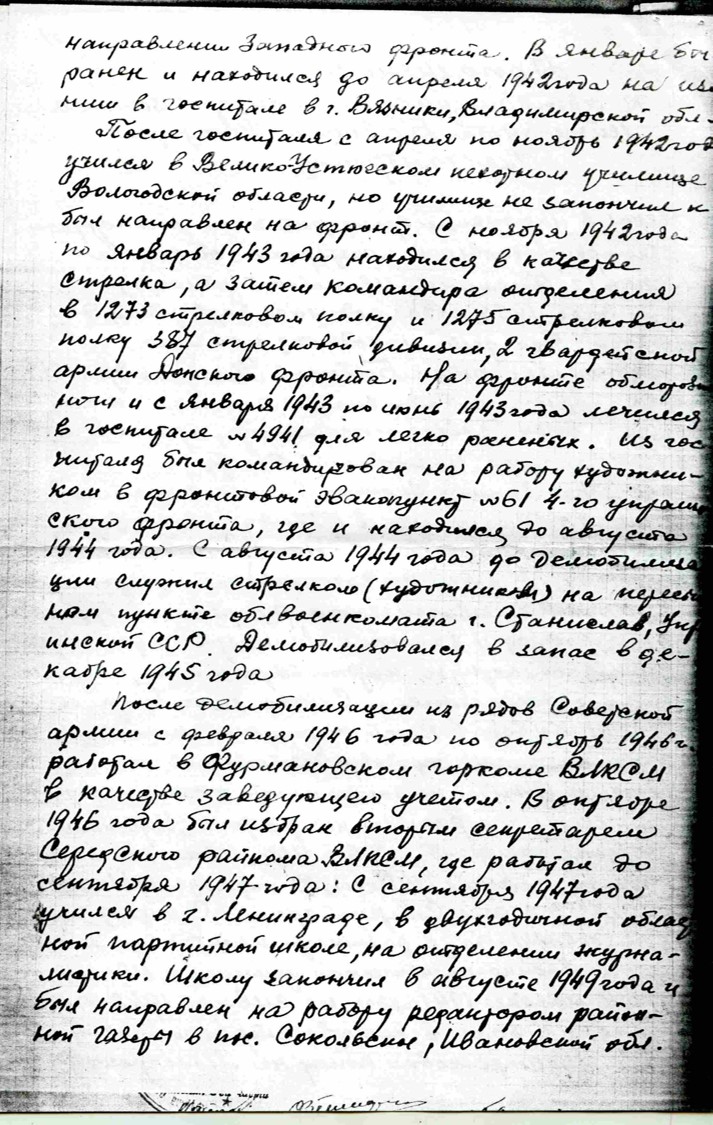 После ранения молодого солдата отправили учиться на сержанта в Велико-Устюгское Пехотное училище, где он провёл семь месяцев, но, так и не окончив курс, был отправлен на фронт в ноябре 1942 г.