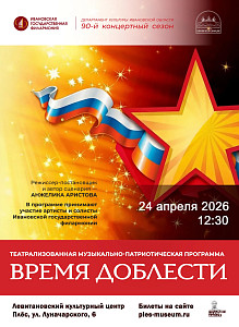 24 апреля 2026 г. в 12.30 в Левитановском культурном центре г. Плёса Ивановская государственная филармония представит театрализованную музыкально-патриотическую программу «Время доблести». Программа посвящена героям Великой Отечественной, Афганской и Чеченской войн, а также тем, кт...