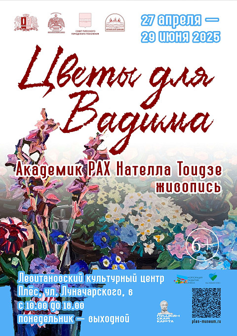 27 апреля 2025 г. в Левитановском культурном центре г. Плёса начнёт работу выставка «Цветы для Вадима» заслуженного художника РФ, академика РАХ Нателлы Тоидзе, посвящённая памяти её супруга – выдающегося российского кинорежиссёра и педагога, народного артиста РФ Вадима Юсуповича Абдрашитова (1945-2023).