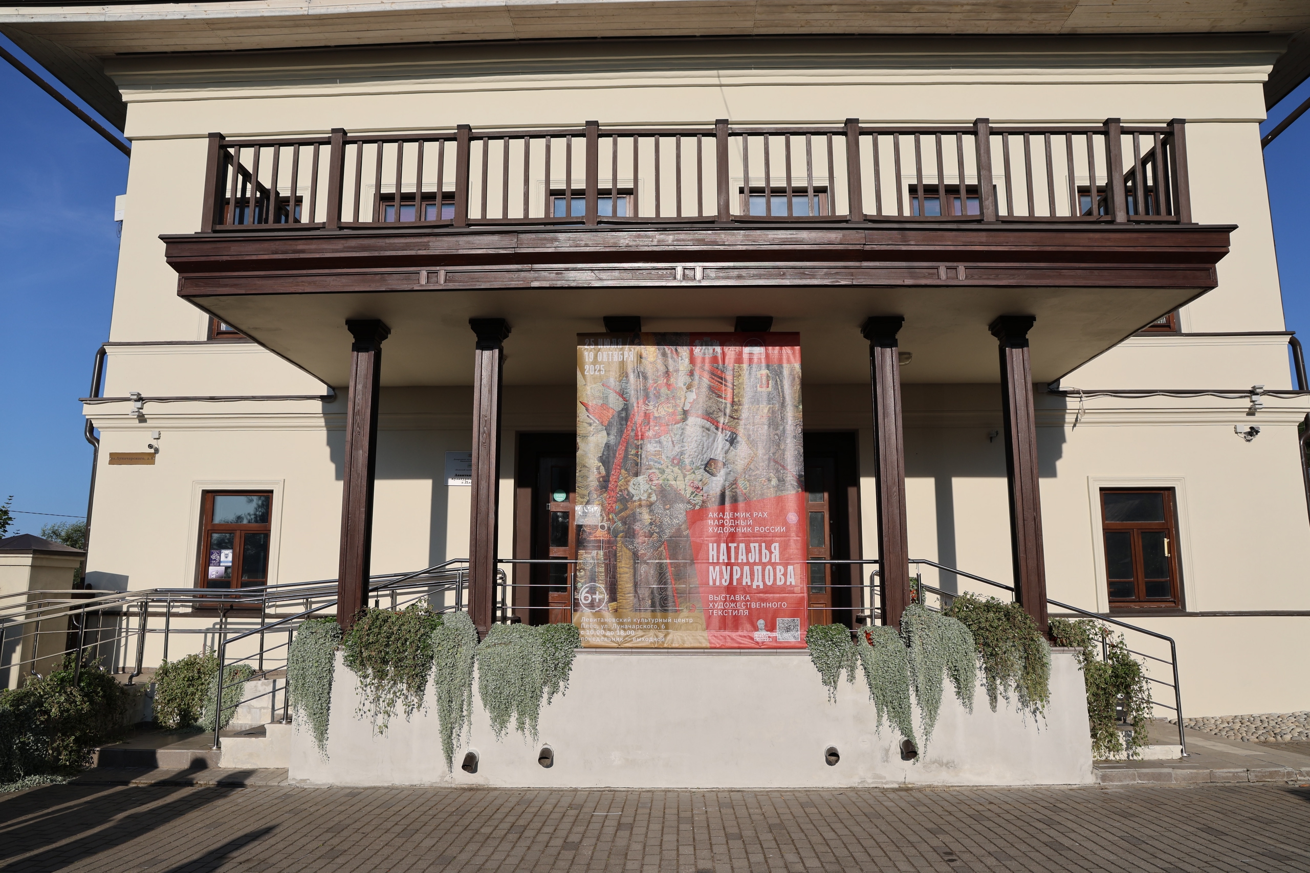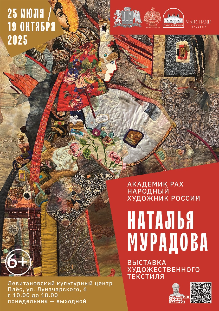 25 июля 2025 г. в 17.00 в Левитановском культурном центре г. Плёса состоится торжественное открытие персональной выставки мастера художественного текстиля, народного художника РФ, академика Российской академии художеств Натальи Мурадовой. Проект подготовлен в сотрудничестве с московской галереей Marchand Gallery, резидентом и другом которой является Наталья Владимировна. Зрителям будут представлены оригинальные текстильные панно, включающие в свою композицию арт-объекты, созданные автором в других видах искусства: графике, живописи, фотографии, росписи по ткани, в области текстильного дизайна. Органично вписанные в текстильное окружение, они не только дополняют художественное произведение, но и акцентируют его смыслы.