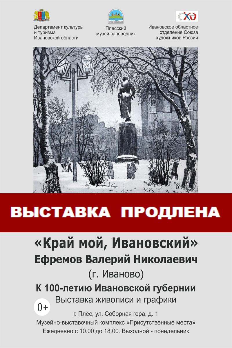 20 апреля 2018 г. в 15.00 в Музейно-выставочном комплексе «Присутственные места» в зале первого этажа состоится открытие выставки Валерия Николаевича Ефремова «Край мой, Ивановский», посвященной 100-летию Ивановской губернии.