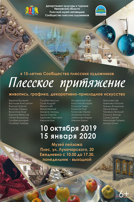 Сообщество плесских художников вот уже четвертый раз открывает в залах Музея пейзажа Плесского музея-заповедника традиционную и долгожданную выставку «Плесское притяжение». В выставке принимают участие более 40 художников, костяк которых входит в творческий союз «Сообщество плесских художников», созданный в 2004 году. Эта выставка посвящена 15-летию творческой организации.