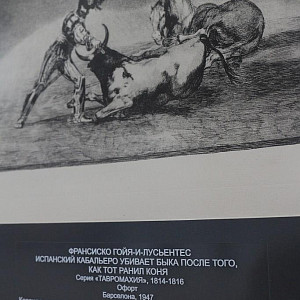 Экспонируемые на выставке в Плесе более 130 офортов и литографий Франсиско Гойи и Пабло Пикассо - двух ярких сыновей своей родины, навеки обрученных с ее историей, культурой и традициями - раскрывают нам в XXI в. этот удивительный мир культа быка и корриды, где властвуют азарт и риск, свет и тени, эмоции и страсти, победа и поражение, погоня за жизнью и всегда остающиеся на арене песок и кровь…