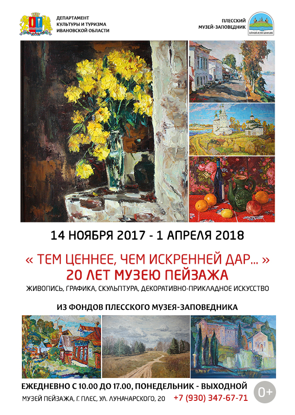 Со дня рождения Музея пейзажа - 1997 г. - в его выставочных залах прошло более ста персональных и тематических выставок ведущих пейзажистов страны, оставивших в дар Плесскому музею-заповеднику свои лучшие произведения. Завершая юбилейный, 20-й год, Музей пейзажа представляет с 14 ноября 2017 г. выставку даров и с благодарностью вспоминает всех, кто внес свою лепту в сохранение культурного наследия нашей страны.